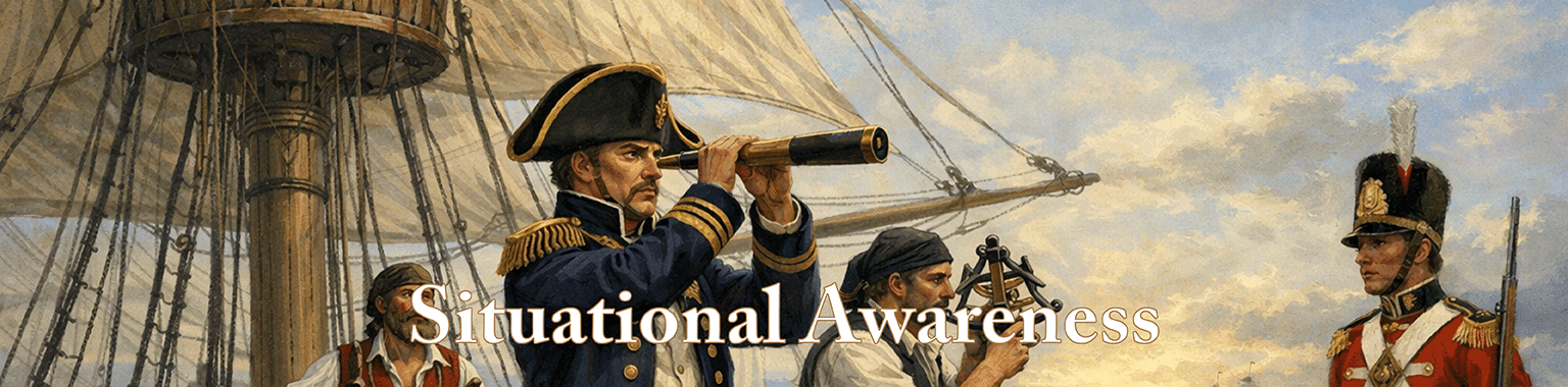 On a 19th-century man-of-war, awareness started with the senses: eyes on the horizon, ears on the drum, and minds on the weather. Lookouts, signalmen, and officers constantly assessed changes in wind, sea state, rigging, and distant sails. Early detection meant precious seconds to beat to quarters and secure advantage.